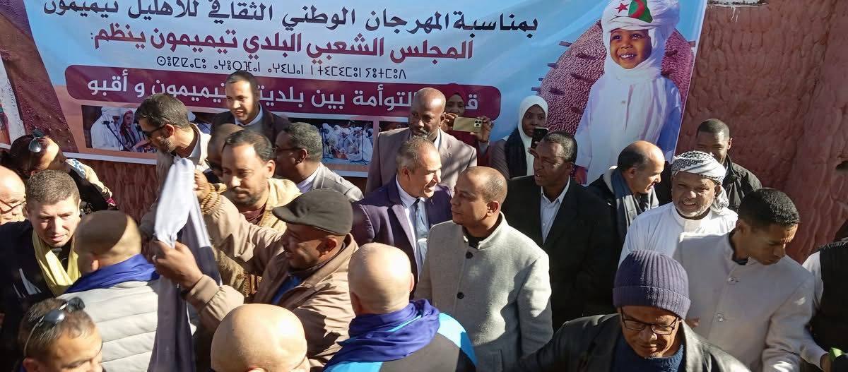 تمّ اليوم الموافق 2025/12/22 على مستوى مطار تيميمون استقبال رئيس بلدية أقبو السيد مولود صالحي ، و ممثل الأمين العام للمحافظة السامية للامازيغية ، في إطار التوأمة بين البلديتين و تتصادف هذه الزيارة بإقامة المهرجان الوطني الثقافي لاهليل، أحد أبرز المهرجانات التي تحتفي بالتراث اللامادي للمنطقة المصنف من طرف اليونيسكو و الذي سوف يكرم خلاله مولاي الصديق سليمان و مولود معمري رحمها الله تقدير و عرفانا لما قدموه من زهرة عمرهما خدمتا لهذا الثراث خاصة و للامزيغية عامة